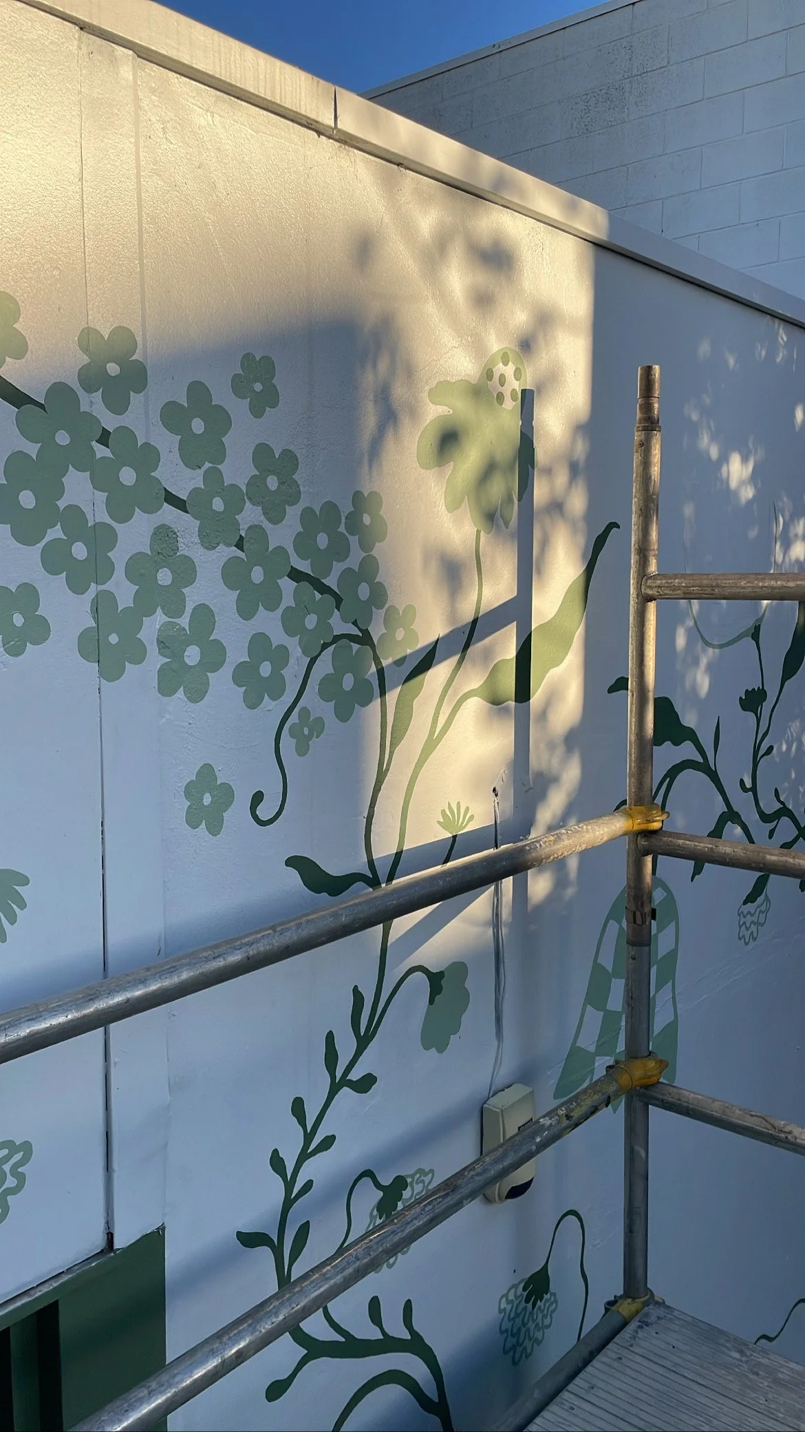 Mural designed as a free-flowing delicate botanical work that wrapped around the building’s facade. Painted with weatherproof acrylic in a duotone palette to colour match the Studio’s branding.