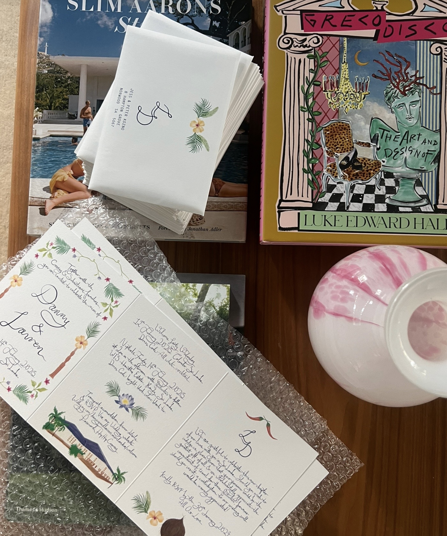 Invitation card for a wedding of Danny and Lavon with tropical floral and palm tree illustrations, event details written in cursive, and a small drawing of a building with palm trees at the bottom.